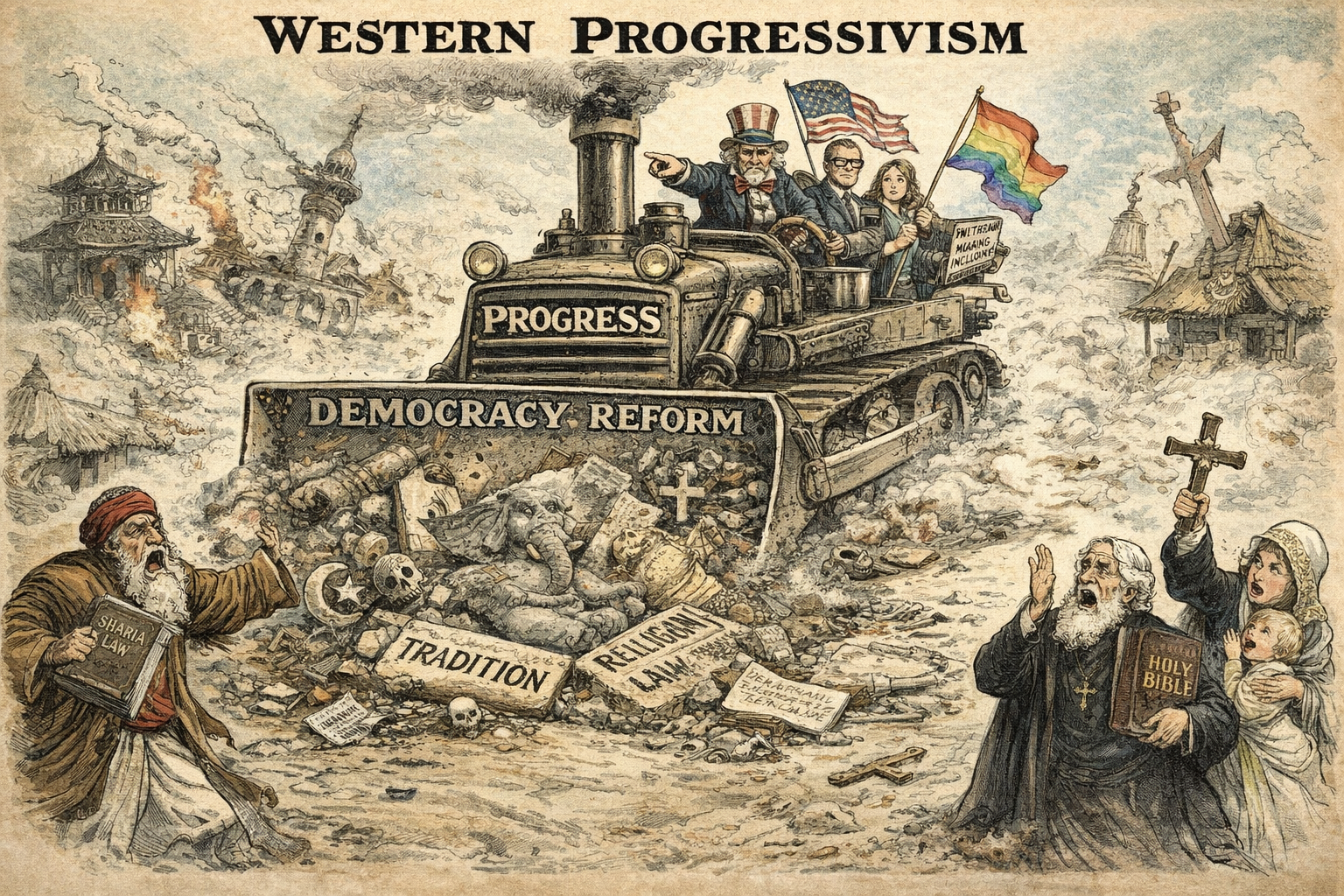 That matters because what the West calls “progress” is often experienced elsewhere as disruption. When democracy, rights language, development policy, or social reform is exported, it often carries a double message: “We honor your dignity” and “your inherited norms must be remade.” Even when the goals are humane, the method can feel like moral intervention backed by money, media, NGOs, diplomacy, and sometimes force. From the receiving end, it can look less like partnership and more like a civilizational rewrite.