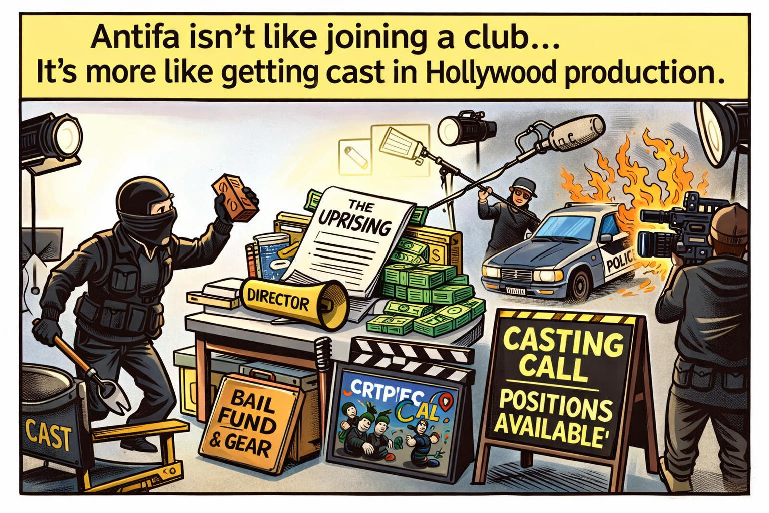Antifa and similar street movements don’t work like clubs you join. They work like Hollywood. A script appears, money shows up, logistics lock in, and suddenly there’s a production. You don’t enlist. You get cast. Think less membership card, more SAG