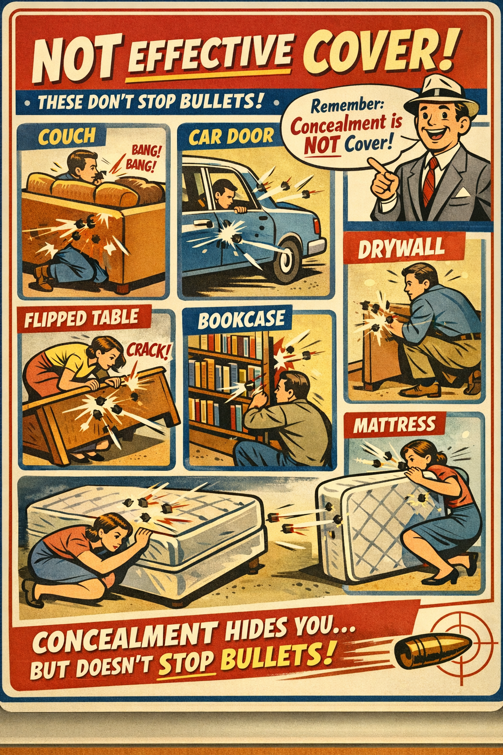 TV reminder: couches, drywall, car doors, desks, kitchen islands, mattresses, bookshelves, and flipped tables do not stop bullets. That’s concealment, not cover. It hides you from eyes, not physics. Movies lie. Ballistics don’t.