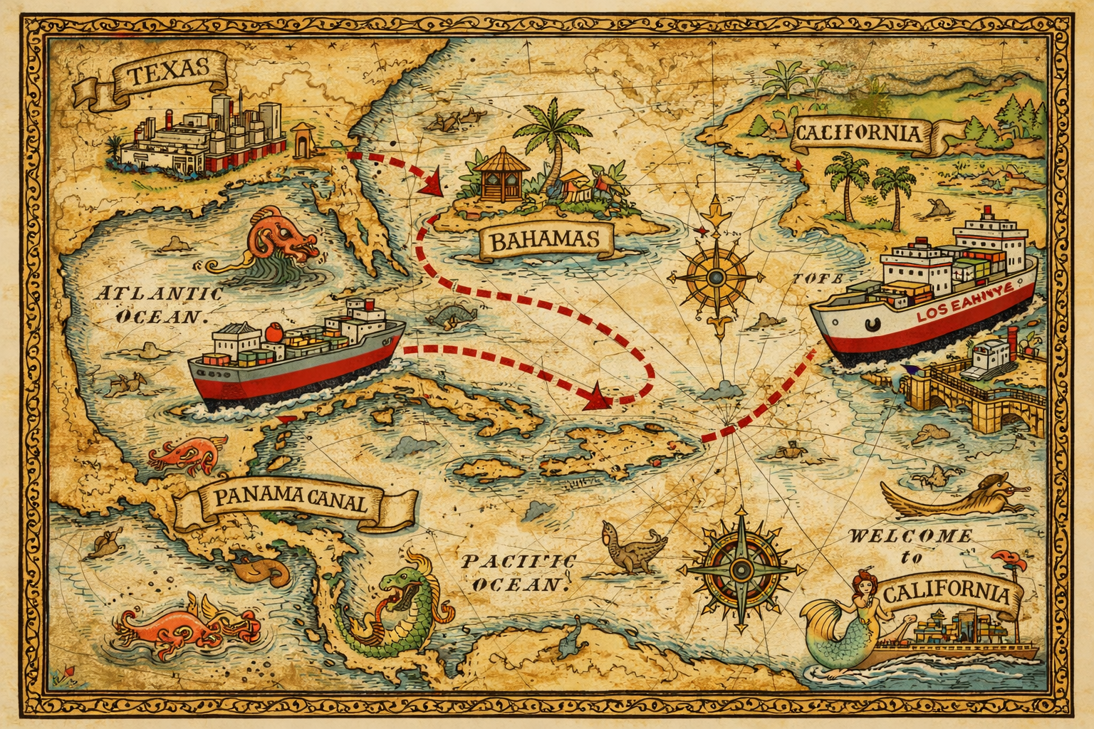 Texas refinery → Bahamas detour → Panama Canal → Port of L.A. All to dodge shipping rules. Per gallon it’s cheap, in total it’s miles of fuel moving fuel. Map accuracy questionable because sea monsters clearly drafted it.