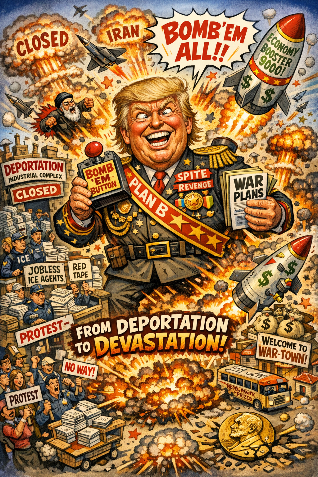 If that massive internal jobs machine gets jammed up by protests, courts, and ratings that look like a flat tire, my prediction is he pivots to the other reliable accelerant. The thing leaders reach for when the home front won’t cooperate and the economy needs adrenaline: foreign conflict. It’s not even ideological, it’s incentives: unify the base, change the channel, flood the zone, and spin “strength” into a headline.