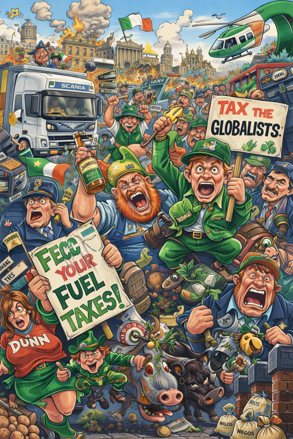 Right now, actual workers in Ireland, truckers, farmers, and other fuel-dependent people, have been out disrupting roads, cities, and supply lines over rising fuel costs. Dublin has been hit, depots have been targeted, and the government has made clear that while protest is technically fine, it has very little interest in treating these people as a legitimate body worth negotiating with. That part matters.