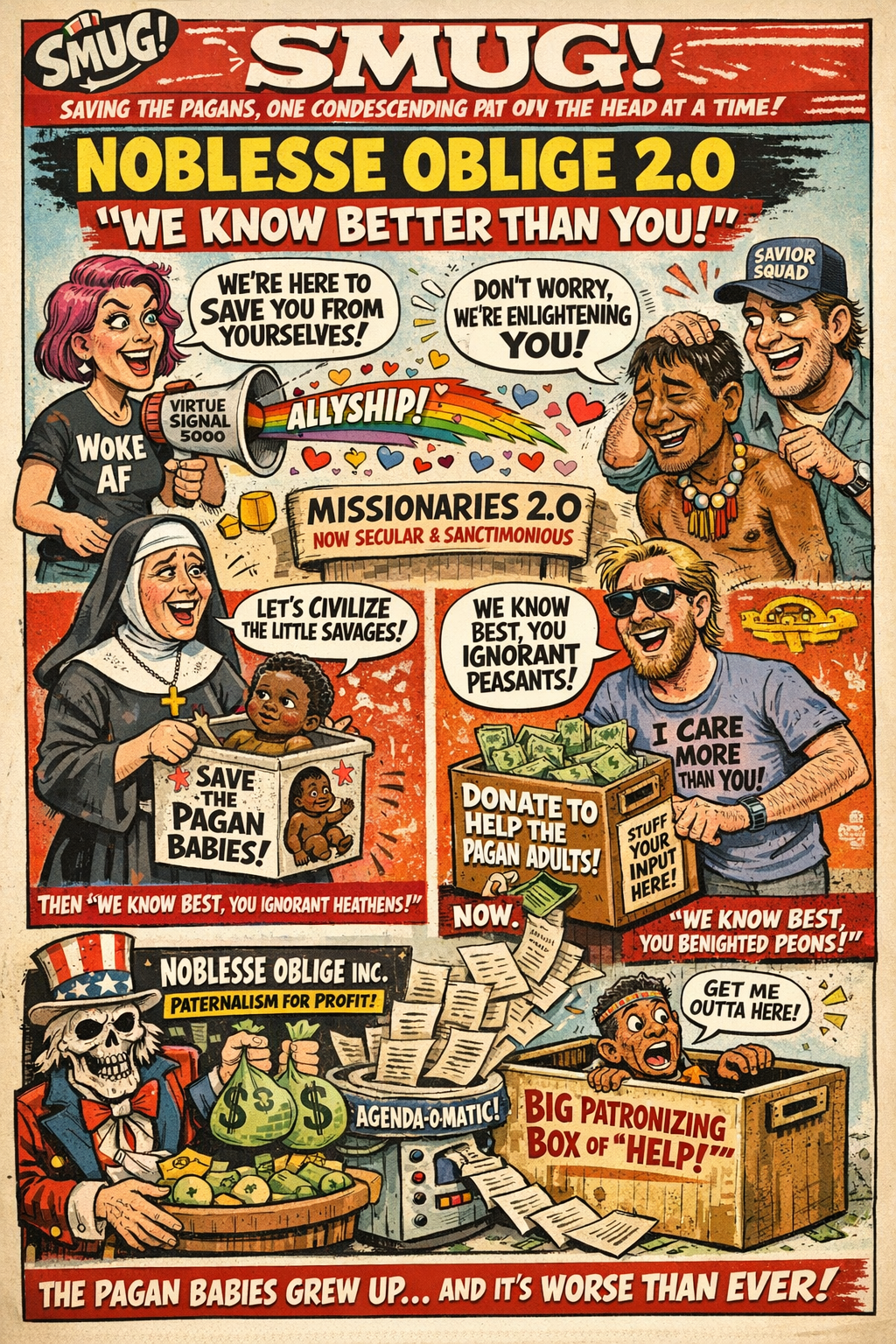 Noblesse oblige used to be recognized as the racist paternalism it is. Secularize it, rebrand it as allyship, and suddenly it’s a virtue. Same skeleton. The pagan babies just got older.