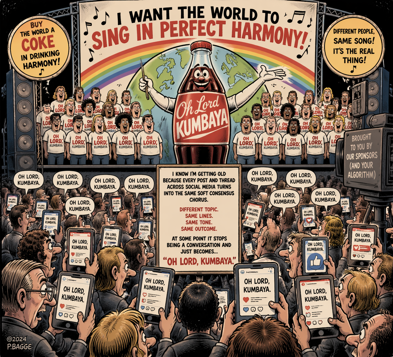 I know I’m getting old because every post and thread across social media turns into the same soft consensus chorus. Different topic, same lines, same tone, same outcome. At some point it stops being a conversation and just becomes ‘oh Lord, kumbaya.’